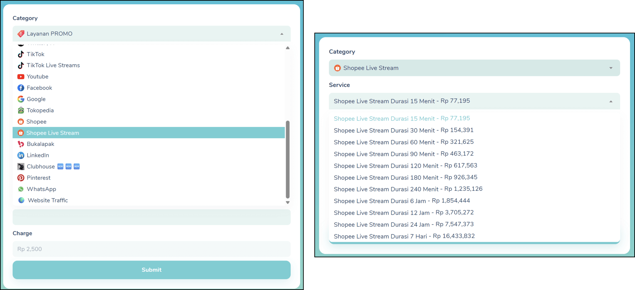 - Pada dropdown Service, pilih durasi menonton live yang Anda butuhkan. Durasi Penonton Live Shopee yang bisa dibeli di TheSocmed.com mulai dari 15 menit hingga 7 hari menonton live secara berkesinambungan.