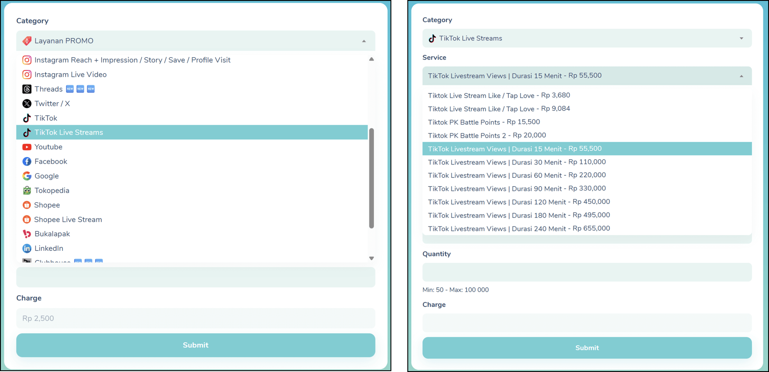 Setelah saldo terisi, pilih layanan sosial media yang Anda inginkan pada menu New Order. Dalam dropdown Category, Anda harus memilih “TikTok Live Streams”.